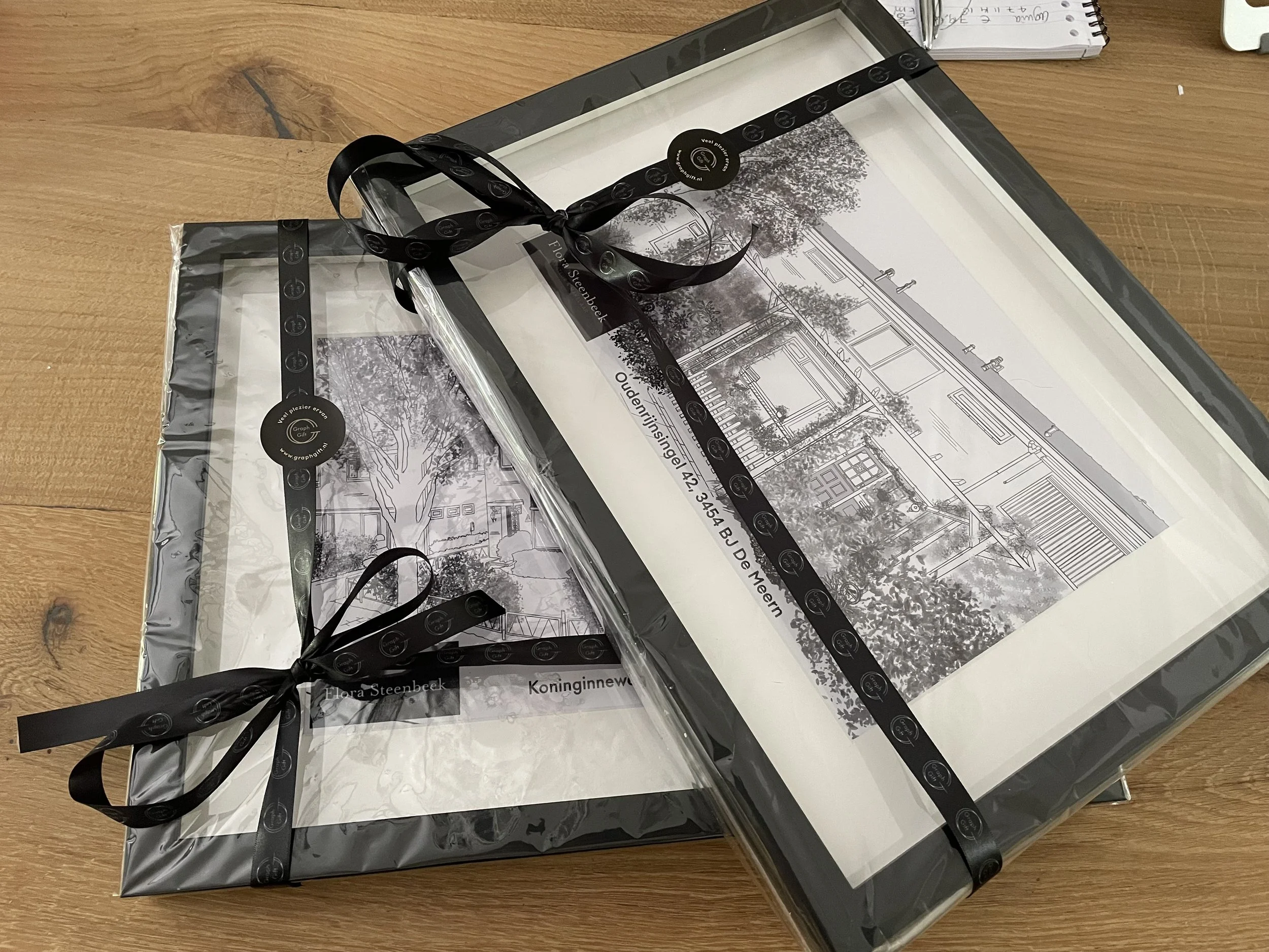 De zwarte lijntekening van het huisportret wordt geprint op glanzend A4-fotopapier en ingepakt in een zwarte lijst (formaat 42×32cm) met mooi passe-partout.