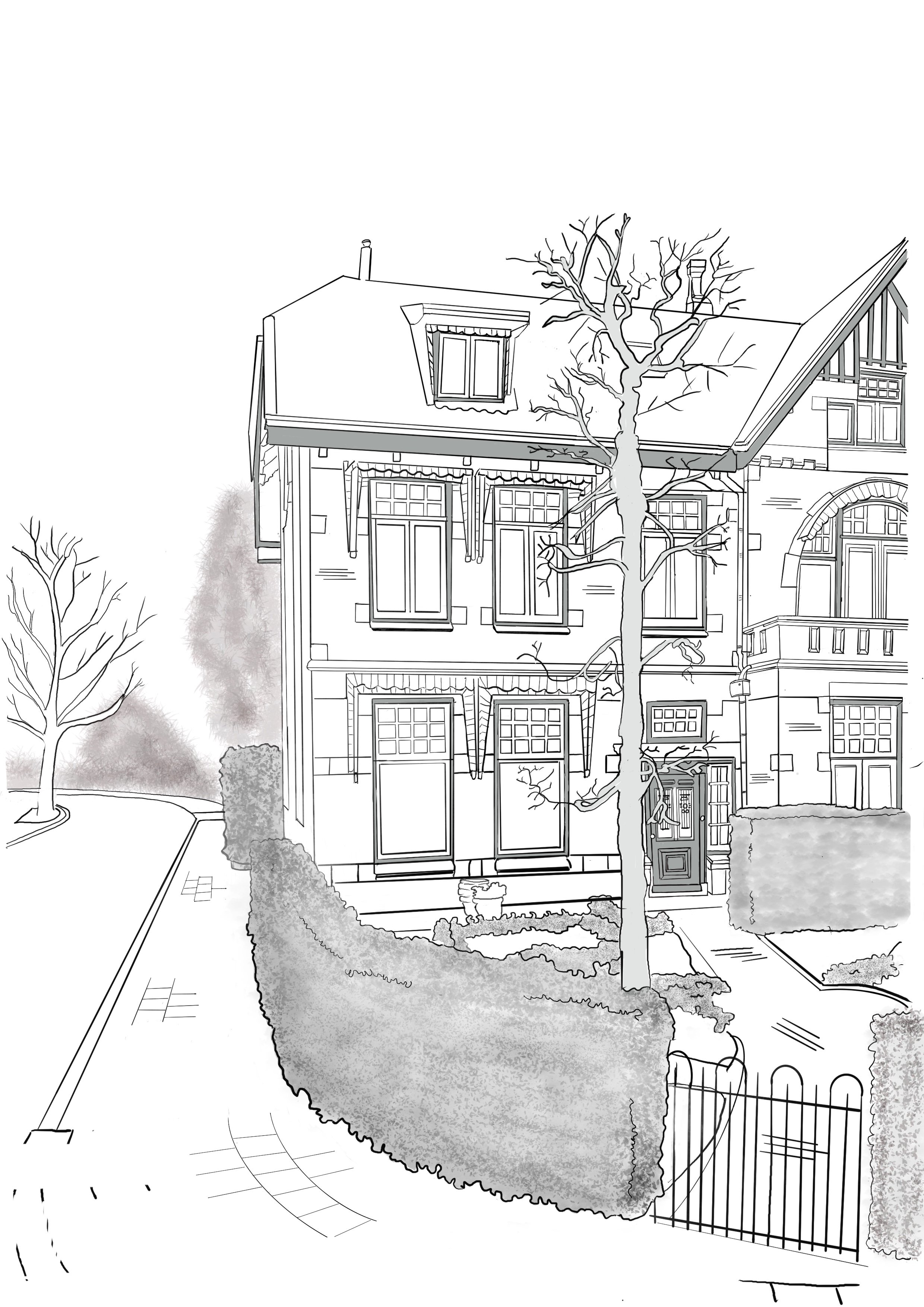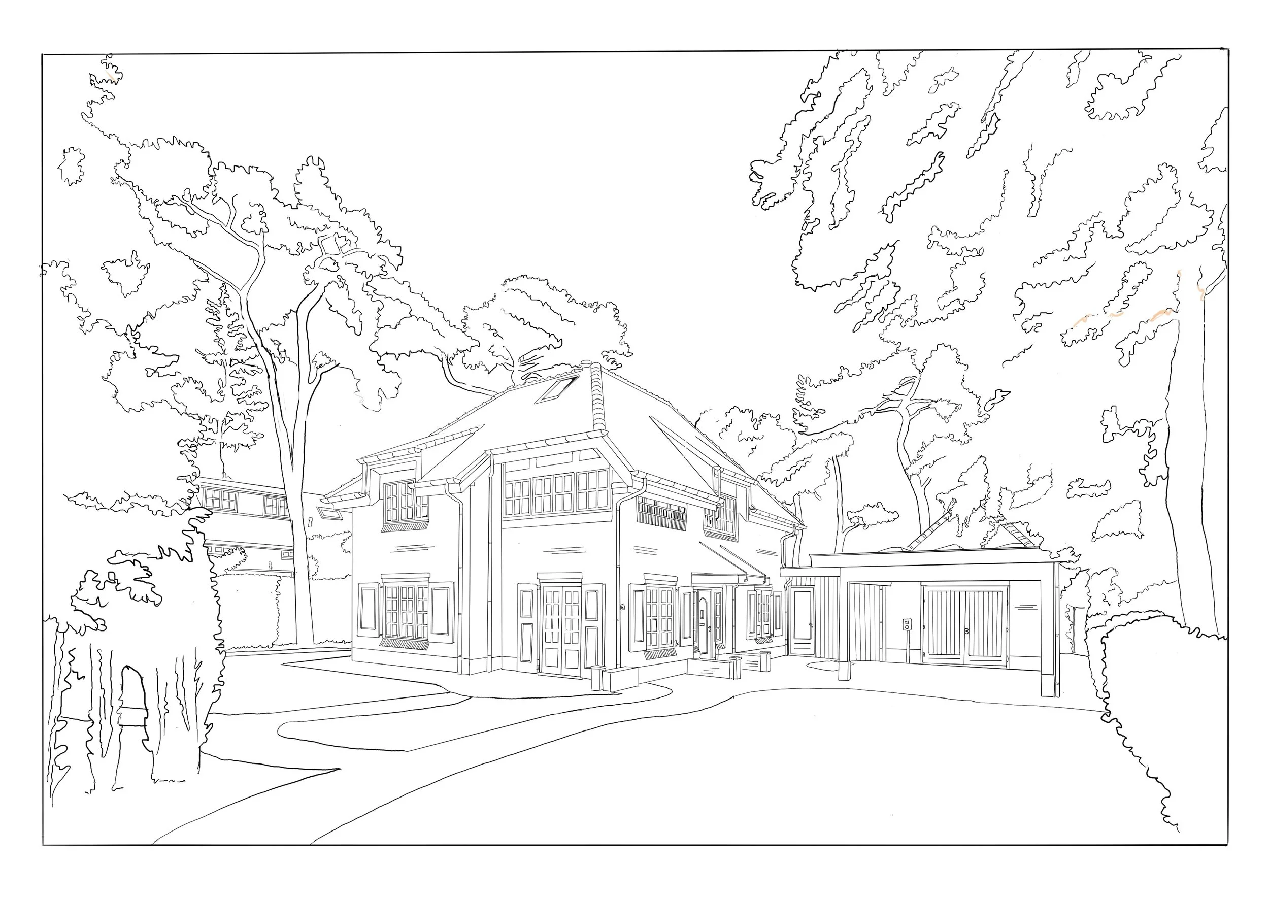 Een zwarte lijntekening van een huisportret in A4-formaat als PDF-bestand.